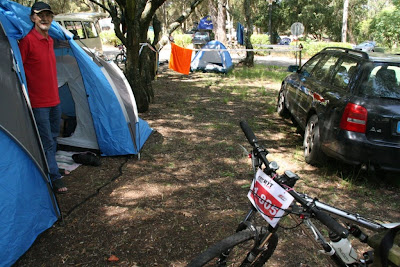 10:00 estava no Parque de campismo de Monsanto. Lá tive que pagar os 2,5€ da tenda e mais 4€ pela família, 40€ de inscrição é um valor avultado mas creio que teria sido mais facilitador terem incluido este custo ao pagamento da inscrição.