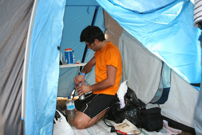 Por volta das 10:00, 10:30 parei então para jantar, a fila era enorme, ainda pensei em comer umas sandes mistas na tenda, mas como ainda faltava um bocado, achei melhor comer uma refeição a sério. Mais de uma hora à espera, pelo menos deu para lavar a cara e limpar os óculos, ainda pensei em tomar um banho mas creio que se o tivesse feito, a vontade de continuar teria seguido com a água...