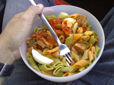 Almoço, servido à maneira, servidos como se estivéssemos num casamento, o pessoal que estava a servir vestidos a rigor com camisa branca colete preto. Uma grande variedade de massas e lasanha bem como uma bela sopa, o melhor almoço que já tive nestes eventos. Almoçei com os meus vizinhos do lado uma equipa de dois, tiveram um furo e um desviador partido obrigou-os a utilizar a mesma bicicleta, selim para cima e para baixo... Mas o que interessa é acabar.