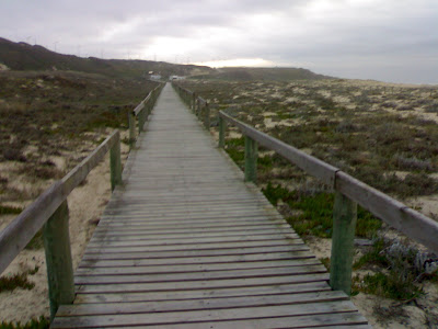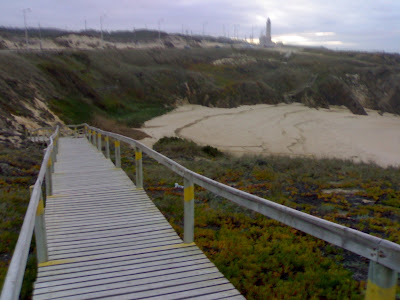 Ficou mesmo uma porcaria, mas aqui fica na mesma. Não me responsabilizo por enjoos aí desse lado. Faz lembrar o Blair Witch Project, lembram-se? Quando eles saem da tenda e desatam a fugir? Só faltou passar a Preto e Branco e eu dizer "Oh my Good, Oh my Good..."(Ainda fico com os pelos levantados quando penso neste filme...) Em direcção à Praia Velha.Fui até São Pedro por estas passadeiras.Devo dizer que é mais difícil do que parece porque a descer,as escadas, estas têm os degraus bem curtos e quando aparece só um degrau, este fica "camuflado" pelos espaços que têm entre eles e não consigo ver o desnível.Já que o objectivo era treinar subidas e descidas, passei pela Praia da Concha. Não me canso de mostrar este farol.Com a desculpa das fotografias lá ia descansado um pouco, pela quantidade das mesmas dá para ver que descansei várias vezes... Já de regresso a São Pedro. Em casa meti o chuveiro com mais pressão e passei água fria nos tornozelos, para ajudar na recuperação do treino. Bela volta, mas para a próxima tenho que começar mais cedo para fazer pelo menos 3 horas, a conclusão que chego é que não sei bem como irei eu conseguir fazer os 28 kms da Trilhos do Pastor, mas ainda faltam 2 meses e até lá espero evoluir mais um pouco. Quanto ao Camelbak, para correr está aprovado, agora só tenho que arranjar um modo de meter no cinto os gels e as barras energéticas, é que nestas coisas a alimentação é essencial e temos que ser minucioso pelo menos 300 a 400kcal por hora, se me descuido muito com isto as pernas ficam logo a doer e a ficarem "queimadas", com a alimentação lá atrás na mochila, mais facilmente esqueço-me desta regra. Tenho que mesmo que seja 30 minutos tentar treinar mais vezes por semana, mas tenho dado prioridade à bicicleta. O tempo final deste treino foi de 1:20H bpm md:160 e mx: 185... Não tive nenhum nenhum problema com as pernas, só senti mais dificuldade numa subida perto do fim mas quando cheguei ao carro, já a ficar de noite, estava a sentir-me bem e tinha vontade de ter continuado, fica para a próxima.
