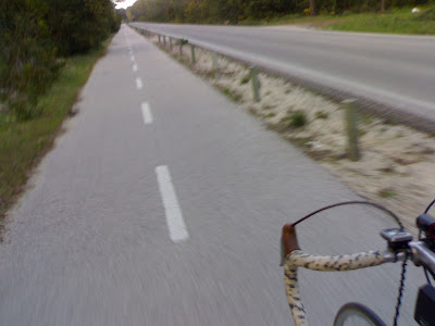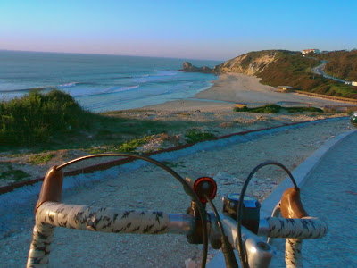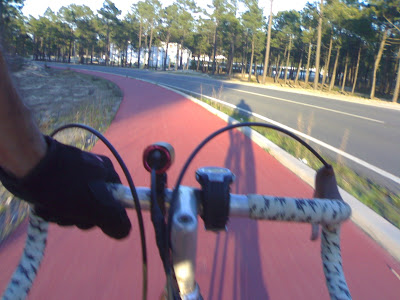Com esta bicicleta, não gasto os pneus que foram feitos para andar no monte, as mudanças mais pesadas puxam mais pelas pernas, a falta do conforto da suspensão faz com que o corpo se habitue a sofrer mais...As mudanças são no quadro, o que quase a tornam numa Single-Speed, primeiro ainda não estão afinadas correctamente e um movimento mais exagerado do manipulo pode fazer com que a corrente salte fora, depois nem sempre consigo ir lá com a mão, depois ainda tenho que ir para a frente e para trás até a mudança entrar. Portanto antes de mudar de velocidade tenho pensado se é realmente necessário ou se tenho que me esforçar mais para manter a mudança. A caminho de São Pedro de Moel. Quando cheguei lá, apanhei a calçada e aquilo é que foi tremer. Para quem quer uns pneus 25 para ser mais confortável, andar com 20 em calçada... Foi sempre a andar devagarinho para ver se não furava, ainda bem que enchi-os com 80 psi.