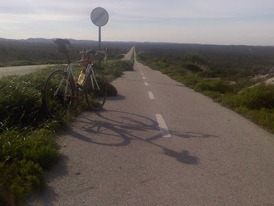 Depois segui sozinho para casa, mas como o sol apareceu em força, não fui capaz de tomar o caminho mais directo. Na estrada Nazaré-Marinha Grande virei para a praia da Falca, como podem ver, a estrada não é estrada, é mais um caminho, mas deu para fazer sem problema. Depois de ver o mar segui para São Pedro de Moel e daí até casa.